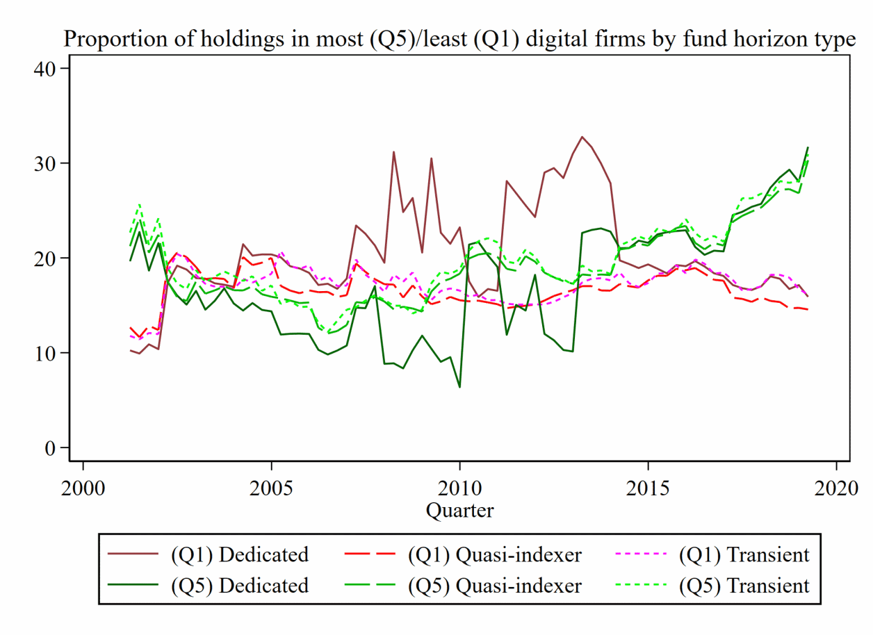 Digital firms are more financially constrained. While institutional ownership helps alleviate these constraints, it is not a panacea for digital firms. During crises, there is a disproportionately large and sudden outflow from long-horizon (“dedicated”) institutional owners’ holdings of digital firms. I study how digital firms choose to cater towards institutional investors.